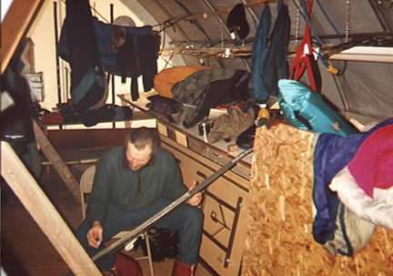 waxes his skis for another day of exploring.